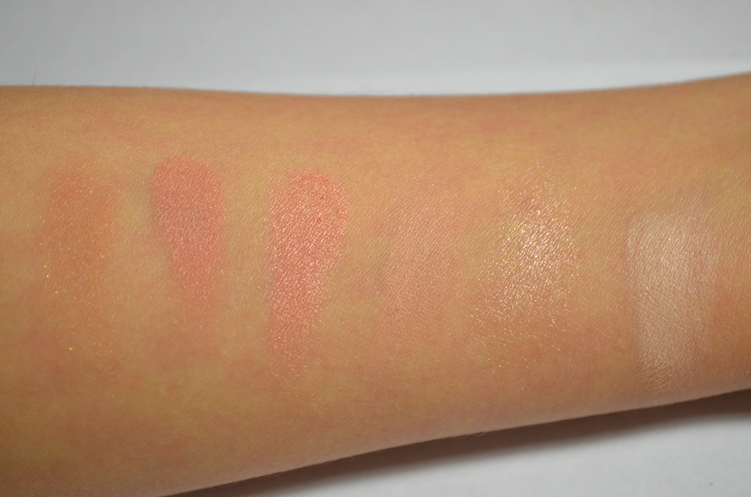 Bronze Veil is a nice light bronze shade with some shimmer, Creme Blush is a nice pinky/peach shade that will fit many skin tones, and the Blush reminds me a bit of Nars Orgasm. (Maybe I can pull up comparisons later) This shade also has some shimmer. The Concealer is a nice light/medium tone and a close match for me. It works well on minor blemishes or dark circles depending on skin tone. The Luminizer is a nice shade that will work on most skin tones, and the Brighten shade works well to perk up dark areas.
