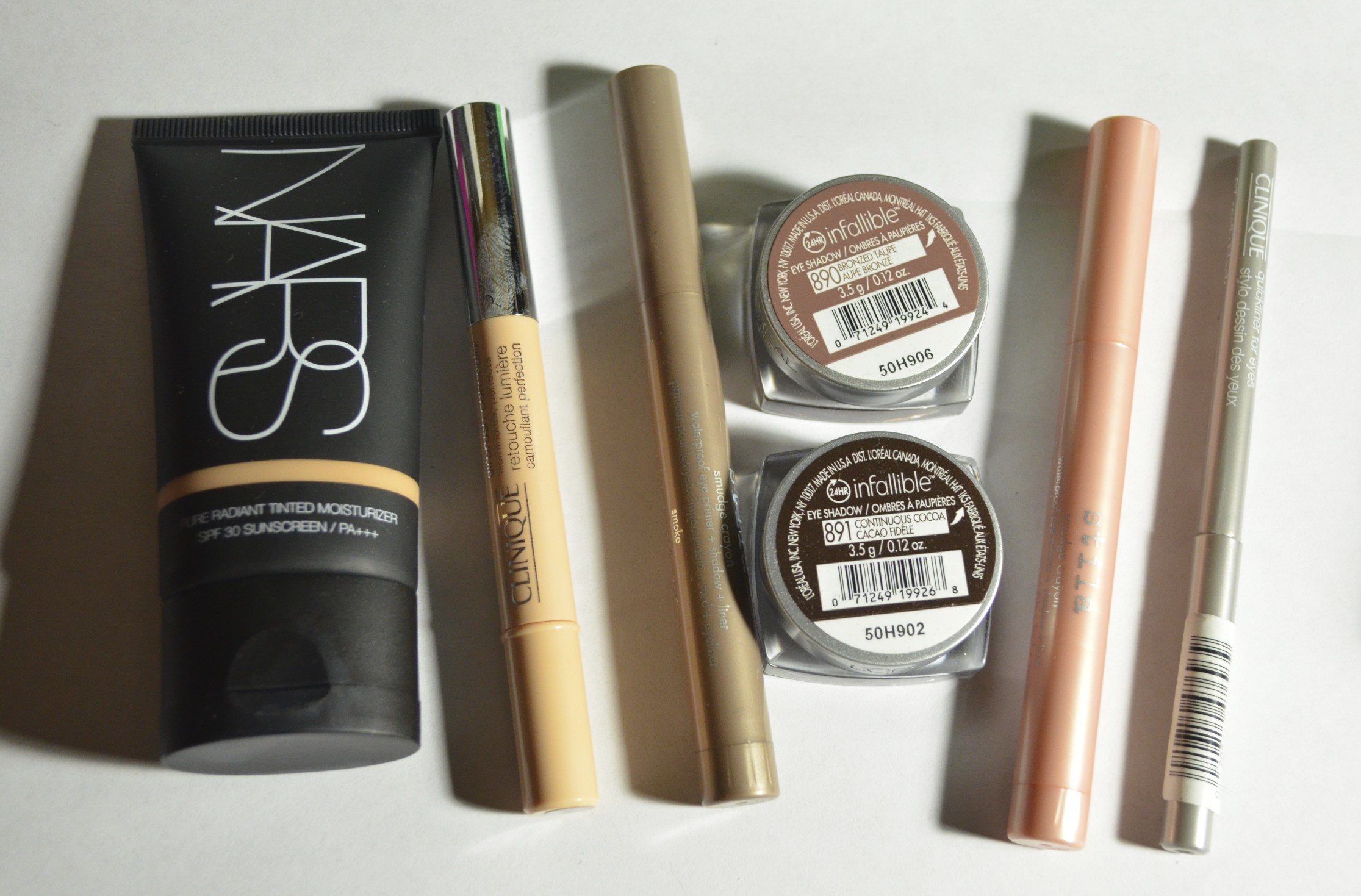 Products: Nars Tinted Moisturizer, Clinique Airbrush Concealer, Stila Smudge Crayon in Smoke, L'Oreal Infallible Eyeshadow in Bronzed Taupe, L'Oreal Infallible Eyeshadow in Continuous Cocoa, Stila Smudge Crayon in Kitten, Clinique Quickliner
