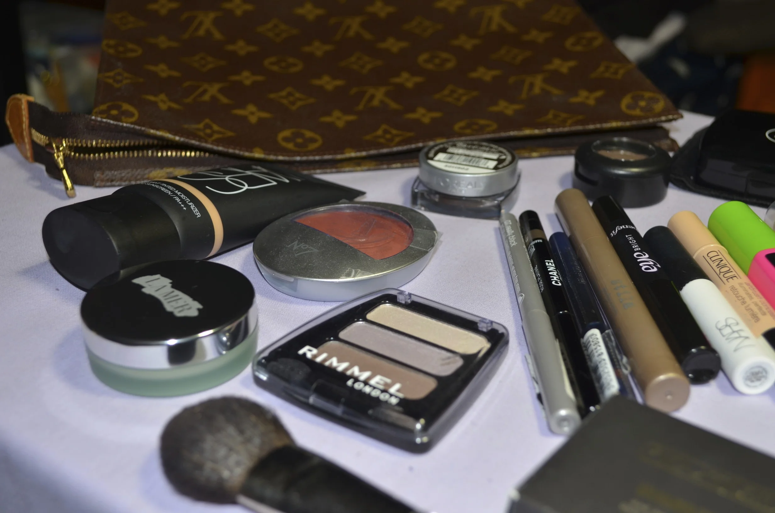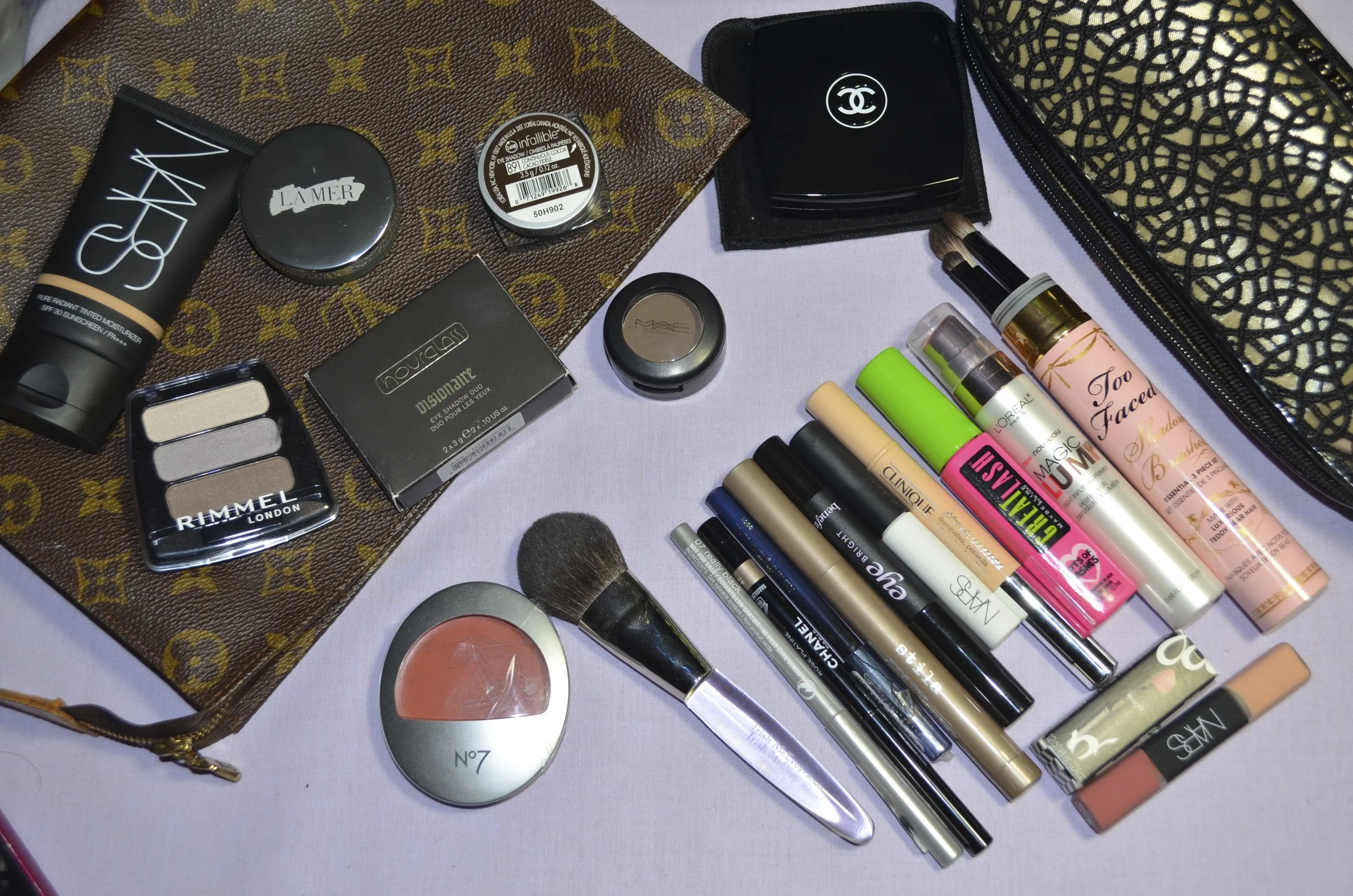 Products: Nars Pure Radiance Tinted Moisturizer, La Mer the Lip Balm, L'Oreal Infallible Eyeshadow in Continuous Cocoa, Chanel Joues Contrastes Blush in Winter Shimmer, Rimmel Eyeshadow Trio in Elements, Hourglass Visionaire Eyeshadow Duo in Suede, MAC Eyeshadow in Concrete, No7 Cheek Tint in Peach Silk, Trish McEvoy Sheer Blush Brush (2B), Clinique Quickliner in Really Black, Chanel Le Stylo Yeux in Rose Platine, Bourjois Duochrome Eyeliner in Noir Bleute, Stila Smudge Crayon in Smoke, Benefit Eye Bright, Nars Smudgeproof Eyeshadow Base, Clinique Airbrush Concealer, Maybelline Great Lash Lots of Lashes, L'Oreal Magic Lumi Primer, Too Faced Essential Eye Brushes