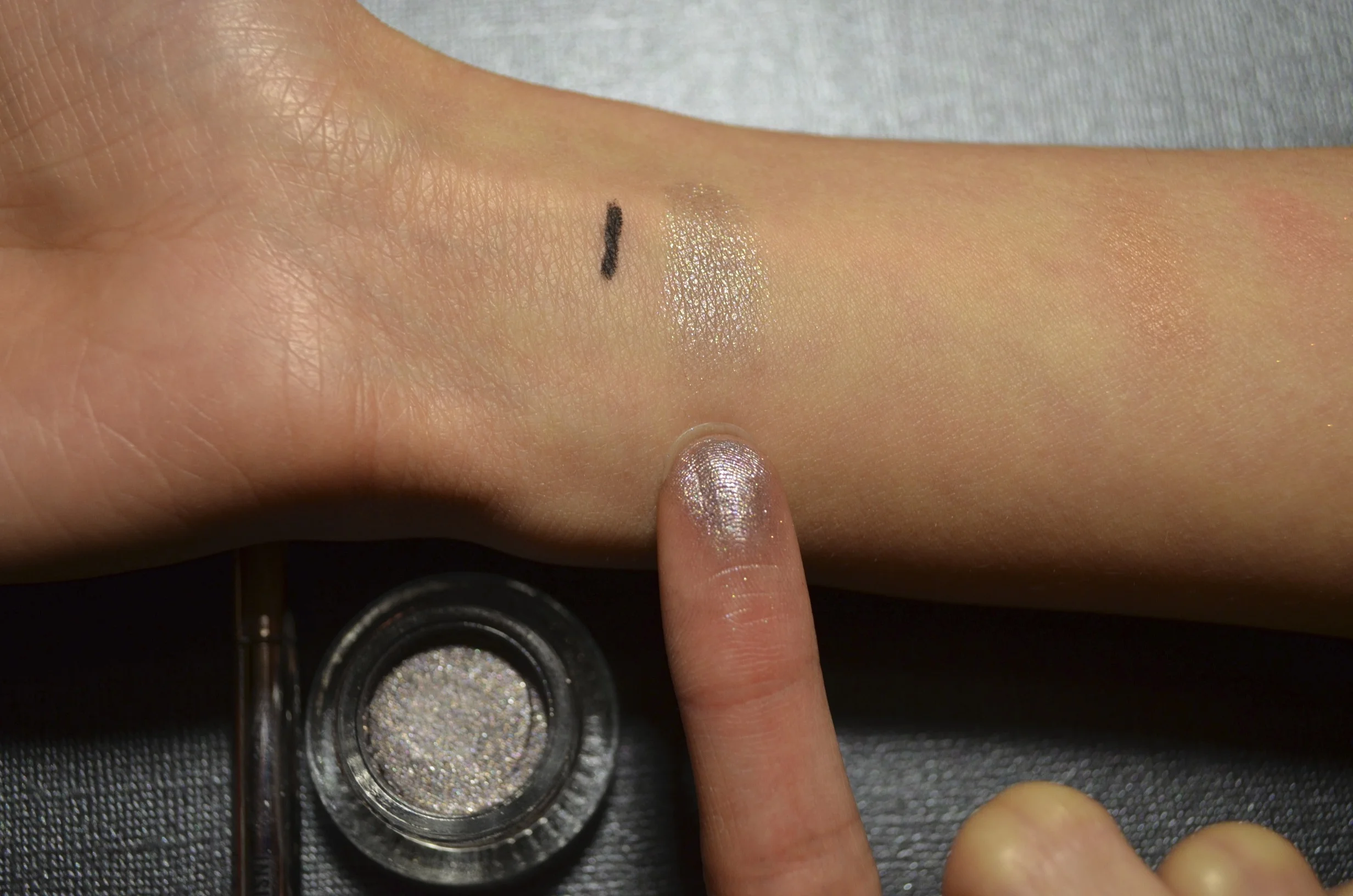 As you can see from the swatch, the liner is quite black, which I always like. The shadow appears more silver than it is in the pot when swatched with a finger, but when I apply it on my eyes, it does appear as a silvery taupe-purple which provides nice definition on my lids.