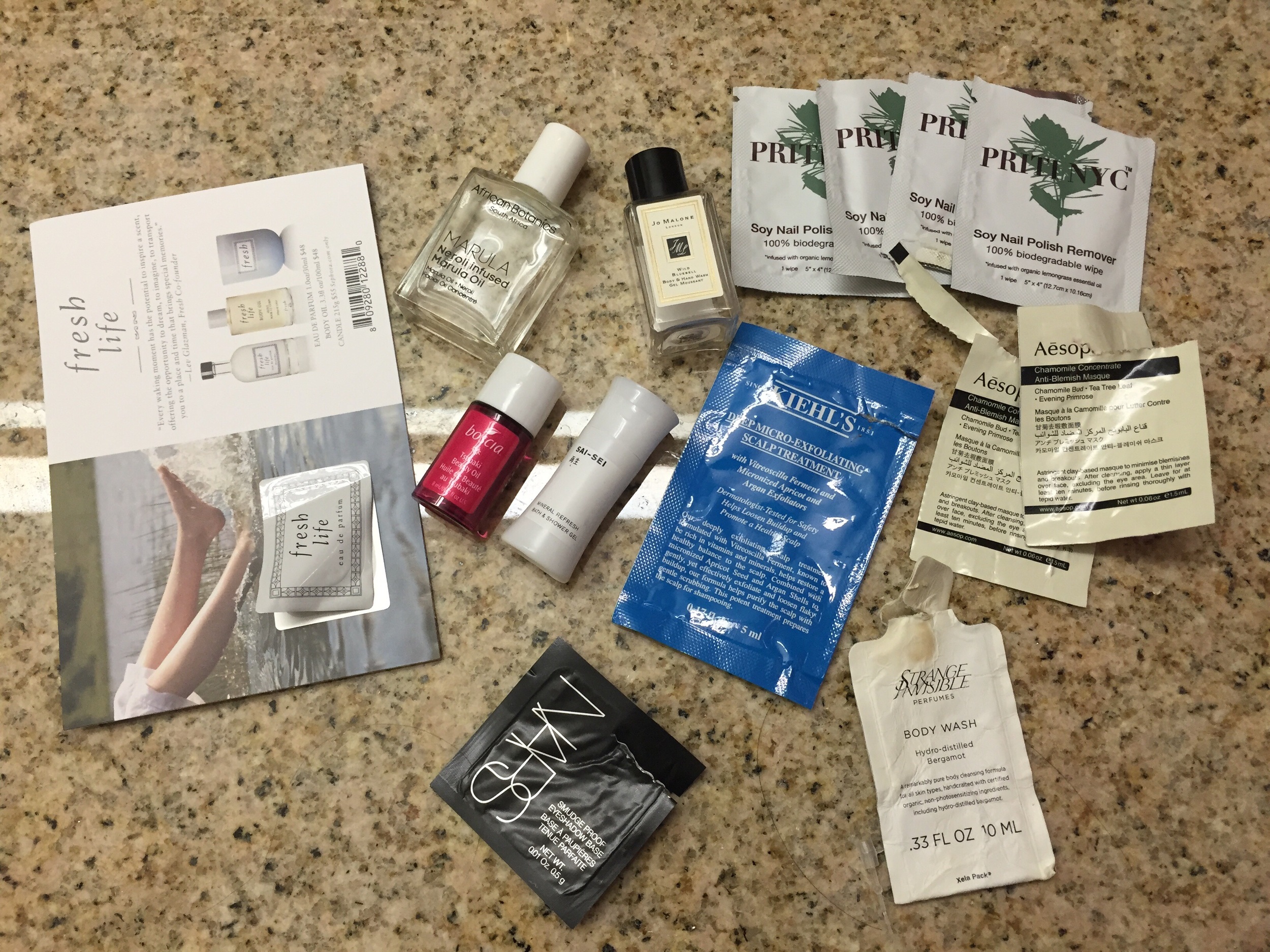 I really like the Priti NYC nail polish wipes, and am nearly done with my set of them. I liked the Boscia Tsubaki OIl, but definitely have other oils I like better. Of the other sample packets, I actually went out and bought the Kiehl's Exfoliating Scalp Treatment and was sorely tempted to buy the Aesop Purifiying Facial Exfoliant and Chamomile Blemish Mask.