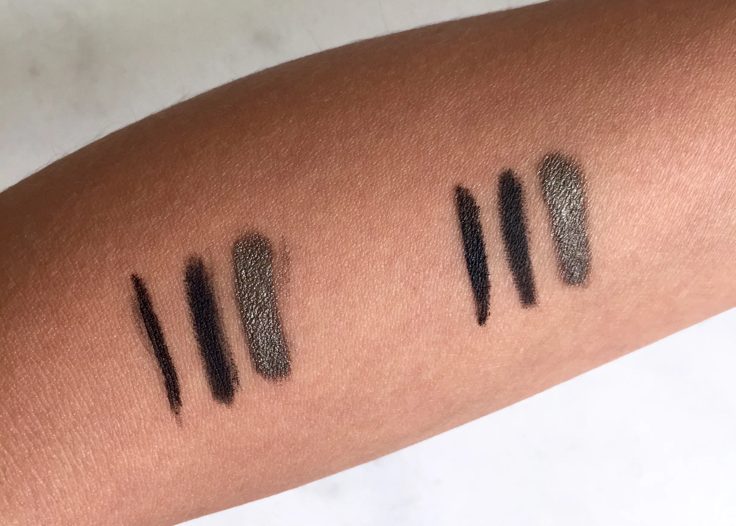 Swatches L-R: Kevyn Aucoin The Precision Liquid Liner, Nars Larger Than Life Liner in Via Veneto, and Laura Mercier Caviar Stick in Khaki